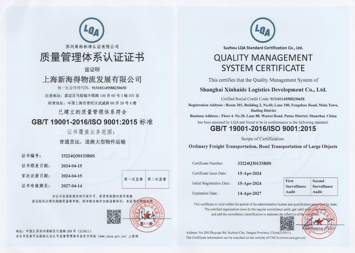 新海得物流嚴格按現代物流操作流程進行標準化運作。已通過國際質量管理體系ISO9001:2015體系認證。運用健全的客戶服務管理系統(tǒng)、車輛管理系統(tǒng),財務管理系統(tǒng)。在查詢、監(jiān)控、追蹤、結算等方面與客戶做到無縫對接,打造了專業(yè)高效的客戶服務體系。